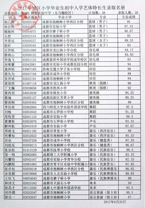 下面是2017年成都树德实验中学小升初艺体特长生录取名单,欢迎大家查看!根据成都市招生考试委员会、成都市教育局《关于做好2017年成都市初、高中艺体特长生招生工作有关事宜的通知》(成招考委〔2017〕19号)精神,现将我校2017年艺体特长生招生录取名单公告如下,公示时间2017年6月26—30日。