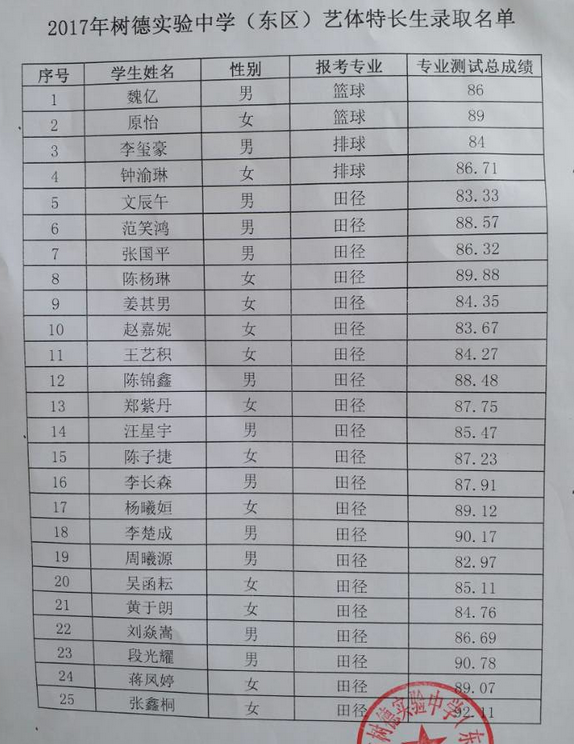 2017年成都树德实验东区小升初艺体特长生录取名单