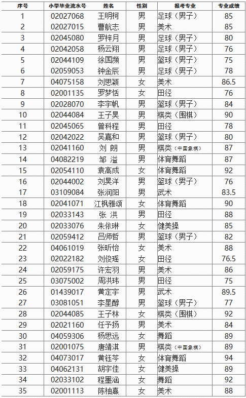 2017年成都青羊实验中学小升初艺体特长生拟录名单
