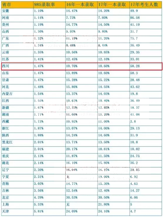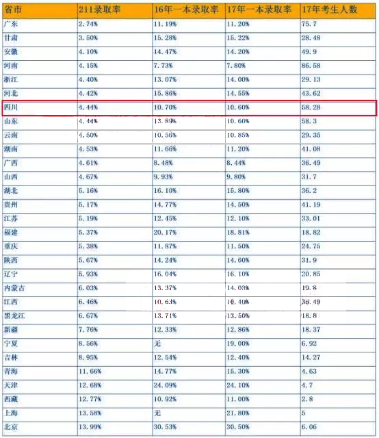 以下是小编汇总了985和211高校在全国各省(市)的录取率,从数据可知,四川考入985和211高校的难度排名均在全国前十,其中,985高校在四川的录取率仅为1.47%,211高校在四川的录取率仅为4.44%,这也意味着,成为高中生中的1%,你才能考上“985”!要想考入“211”,必须要成为高考生中的前4%。
