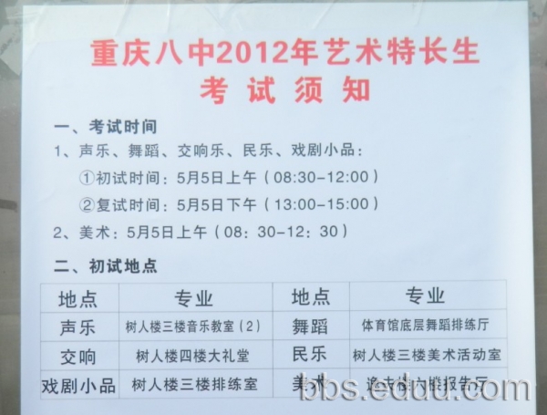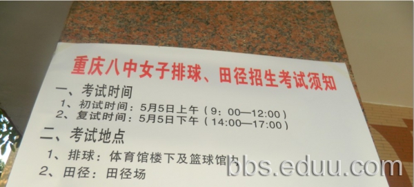 8:30 艺术特长生开始考试;9:00 体育特长生考试考试;至此,八中2012特长生考试正式拉开了帷幕!初赛和复赛都是在5月5日当天完成。
