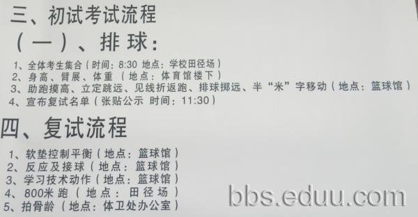 测试流程:到达考场——按考号顺序进入考场——现场测试——初赛考试结束——公布复赛名单——中午休息——复赛——考试结束 PS:学校没有统一签到的地方,大家拿着准考证到达相应的考场就行了,准考证上有参加考试的顺序号,基本上是要按这个顺序号参加考试(体育项目按照考号一个个来,声乐、唱歌、舞蹈这些到后面有点乱了,先来了就可以先进去考试)