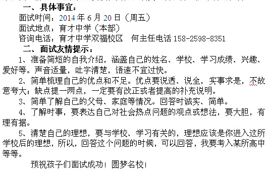 重庆育才中学2015小升初6.20面试要点如下,供参考。