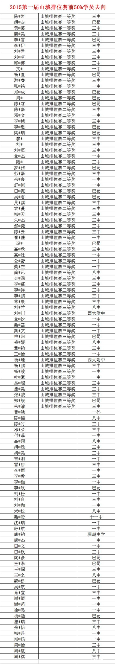 2015第一届山城排位赛学员小升初去向统计