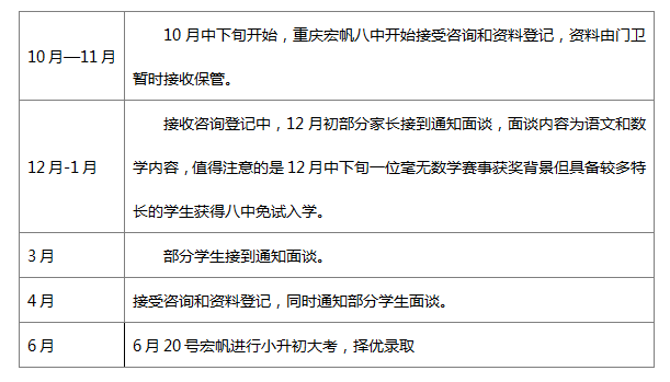 小升初面试是重庆八中宏帆校区小学升初中的重要环节,家长将学生基本信息及证明成绩的资料整理递交到学校,学校根据资料通知面谈,面谈内容主要为笔试,笔试内容为语文和数学,偶尔会有面试,根据面谈结果择优录取。
