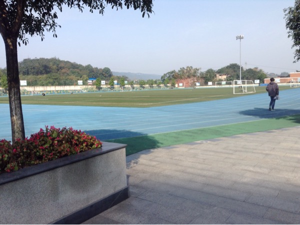 一进校门是阳光下宽广的运动场,零星的学生在周末的下午边享受这美好的阳光边学习,运动场下层是风雨篮球场、网球馆,乒乓球场地。