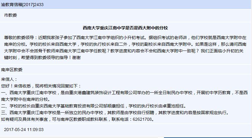 关于江南中学是不是西大附中的分校这个问题,市教委做出如下回答: