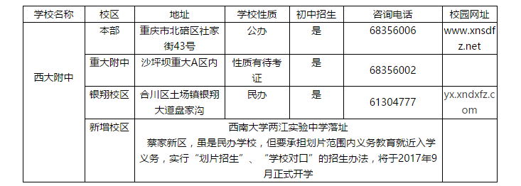 注:【新增校区】西南大学附属中学两江中学于2016年3月21日,西南大学两江实验中学校地址敲定,落户蔡家新区。建成后,整个西南大学两江实验中学占地面积近10万平方米,将于2017年9月正式开学。