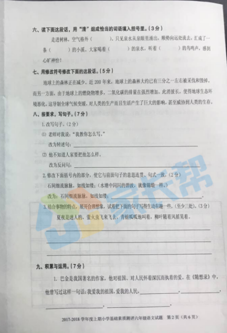 2017-2018重庆大渡口区六年级上期末考试语文试题(2)