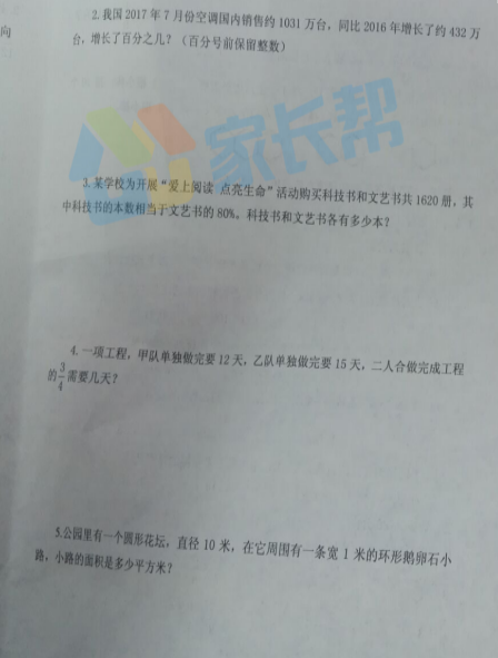 2017-2018重庆大渡口区六年级上期末考试数学试题(3)