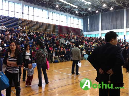 临近考试结束时间,家长们都走出体育馆,在走道等候孩子