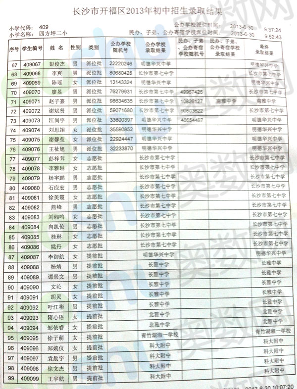 2013年长沙四方坪二小微机派位录取名单三