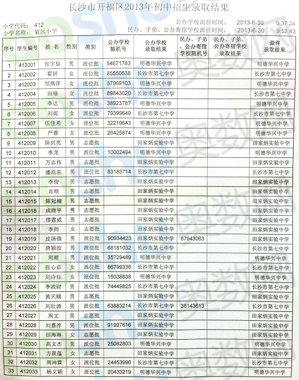2013年长沙紫凤小学微机派位录取名单一