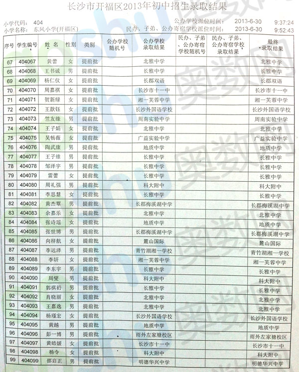 2013年长沙东风小学微机派位录取名单三