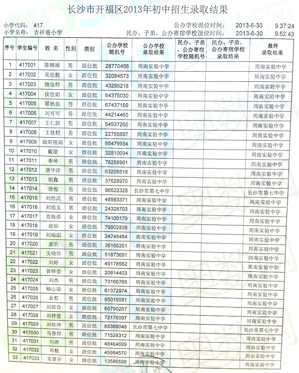 2013年长沙吉祥巷小学小升初微机派位录取结果(2)