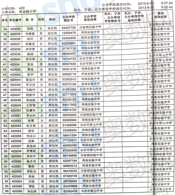 2013年长沙营盘路小学微机派位录取名单二