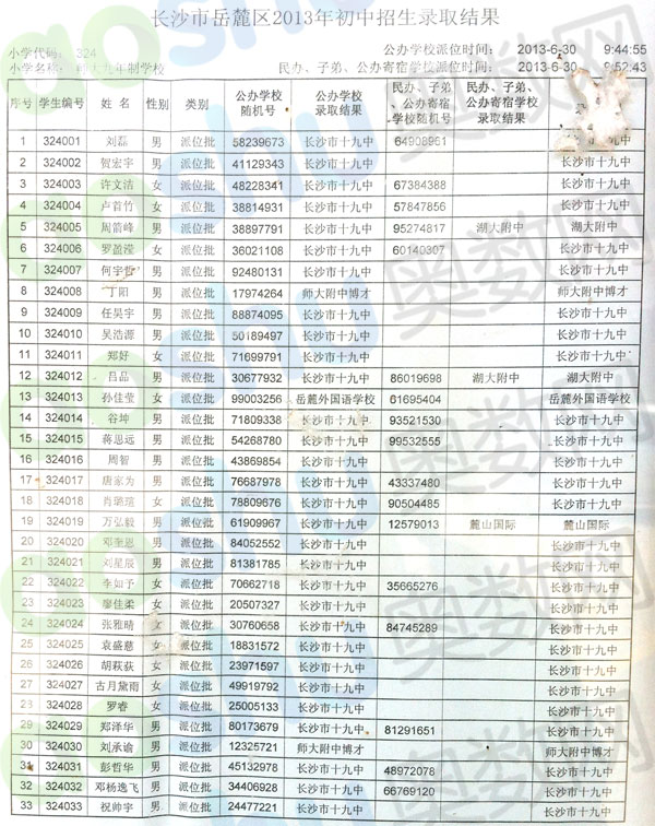 2013年长沙师大附小微机派位录取名单一