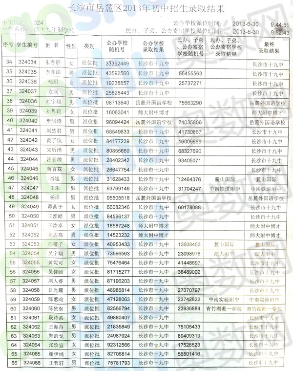 2013年长沙师大附小微机派位录取名单二