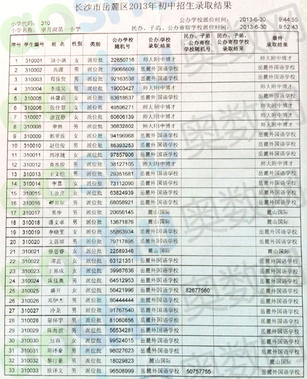 2013年长沙望月湖一小微机派位录取名单一