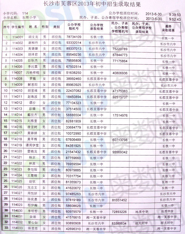 2013年长沙东晖小学微机派位录取名单一