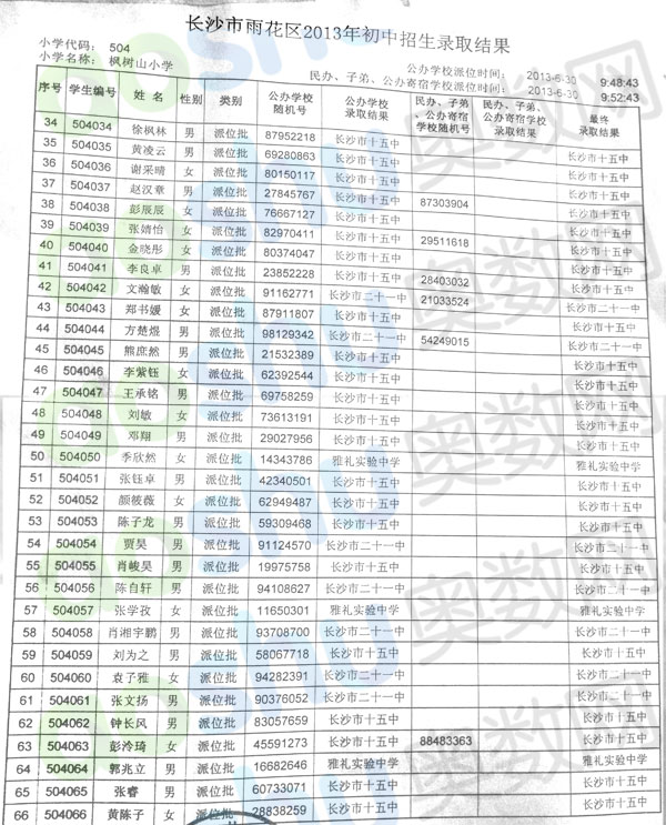 2013年长沙枫树山小学微机派位录取名单二