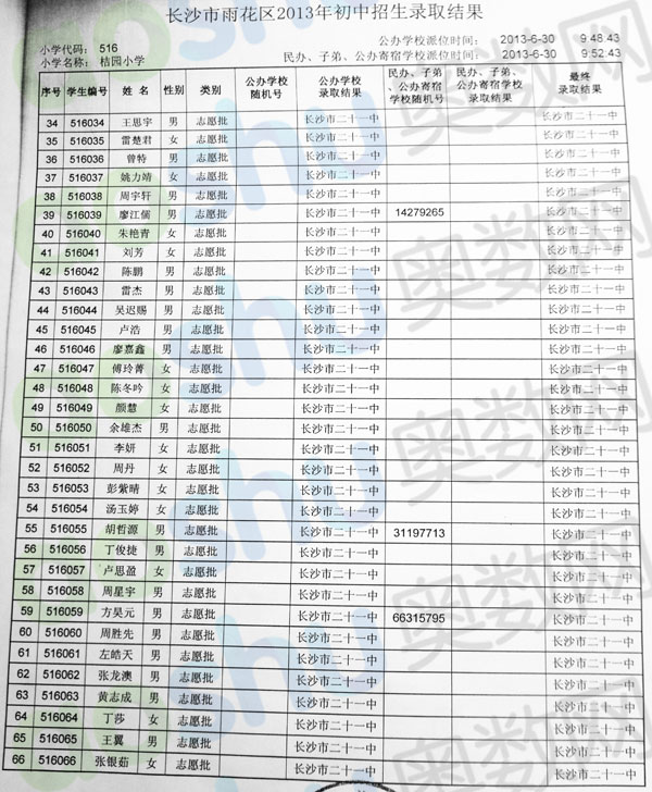 2013年长沙桔园小学微机派位录取名单二