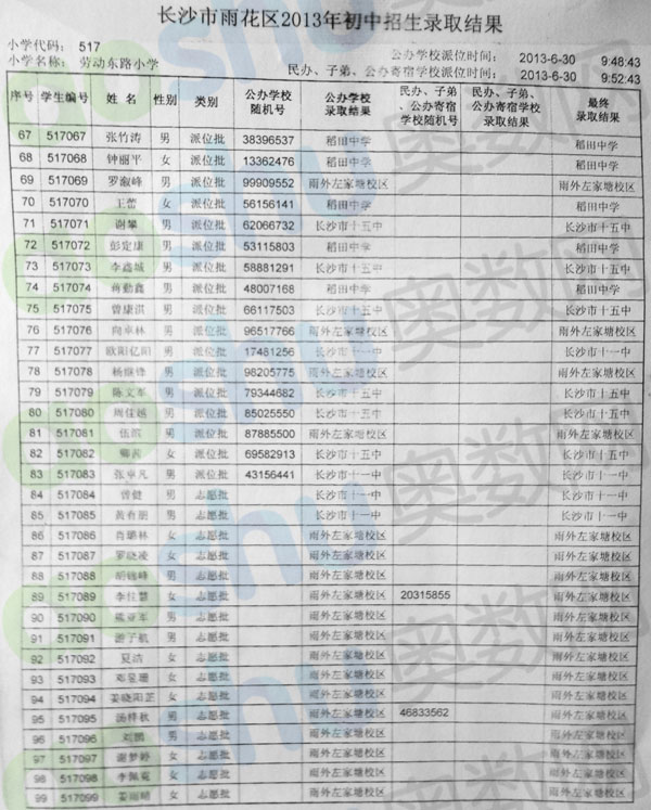 2013年长沙劳动东路小学微机派位录取名单三