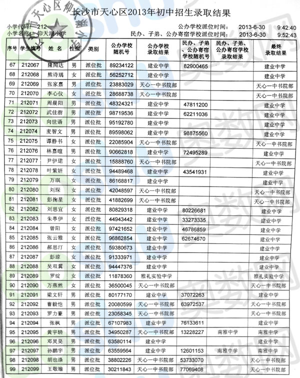 2013年长沙仰天湖小学小升初微机派位录取结果(4)