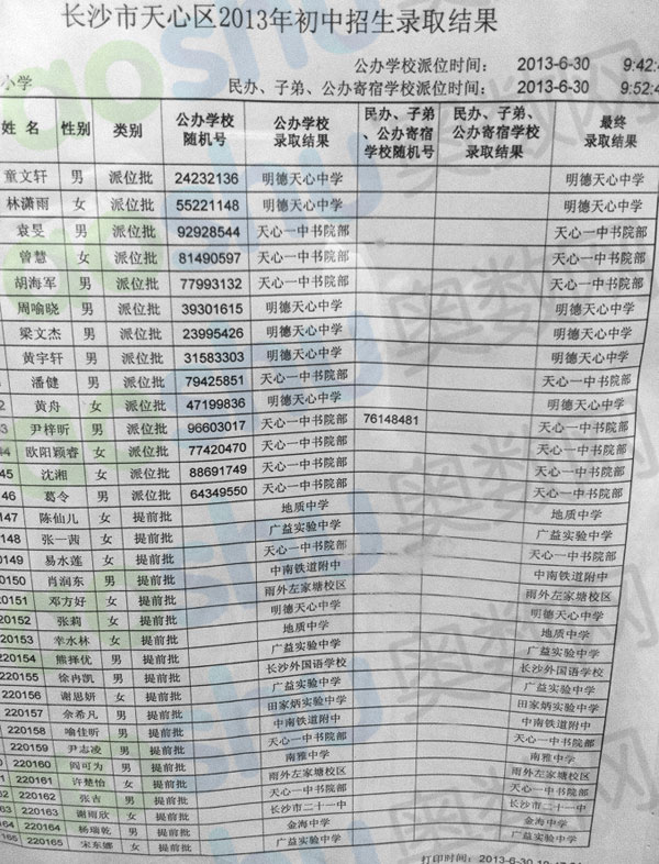 2013年长沙红卫小学微机派位录取名单五