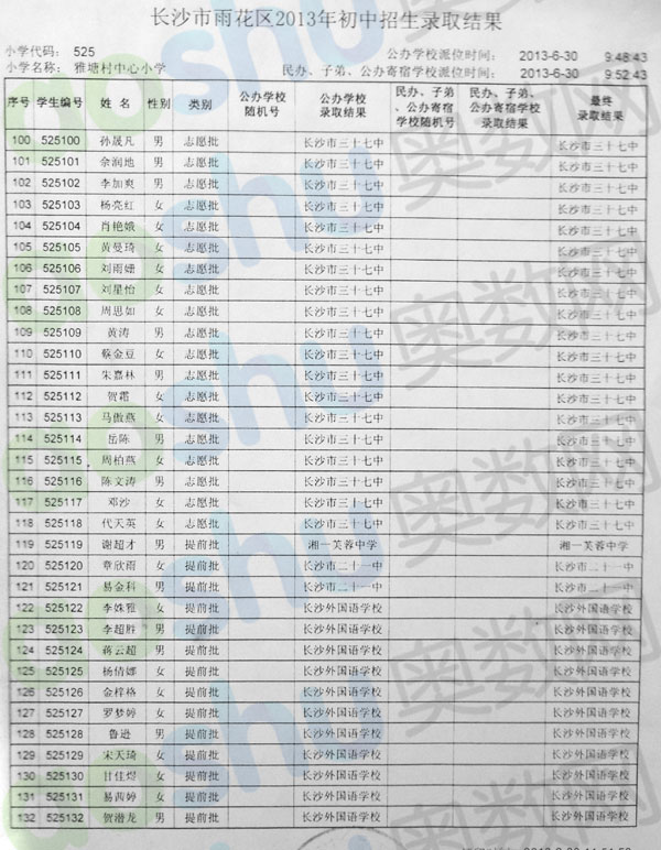 2013年长沙雅塘村中心小学小升初微机派位录取结果(5)