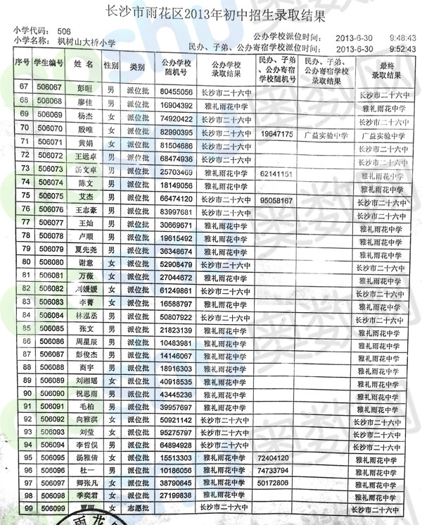 2013年长沙枫树山大桥小学小升初微机派位录取结果(4)
