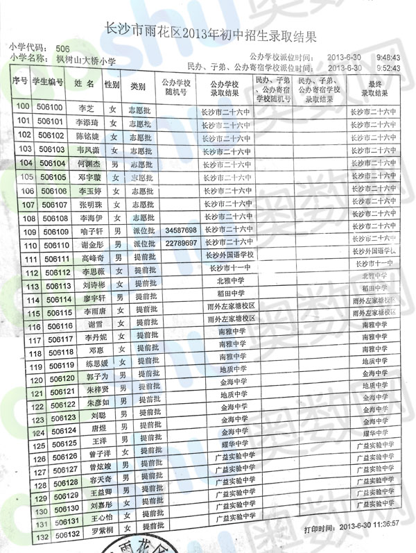 2013年长沙枫树山大桥小学小升初微机派位录取结果(5)