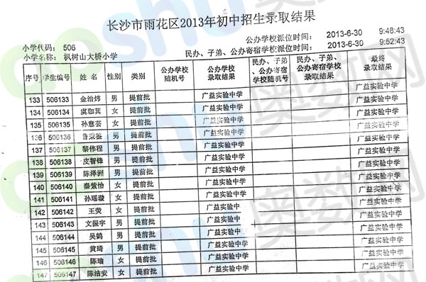 2013年长沙枫树山大桥小学小升初微机派位录取结果(6)