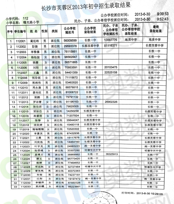 2013年长沙曙光路小学小升初微机派位录取结果(2)