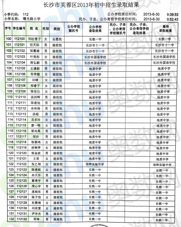 2013年长沙曙光路小学小升初微机派位录取结果(5)