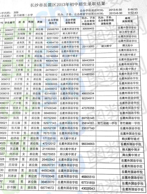 2013年长沙望月湖二小小升初微机派位录取结果(2)