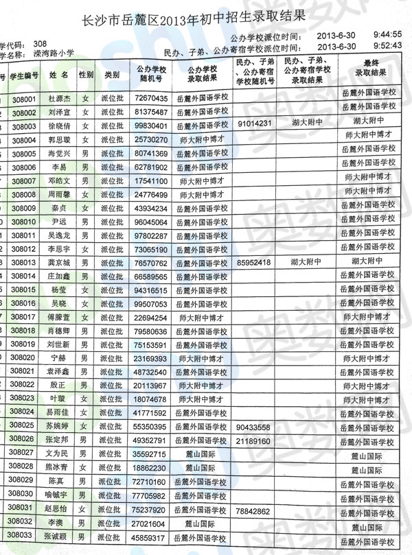 2013年长沙溁湾路小学微机派位录取名单一