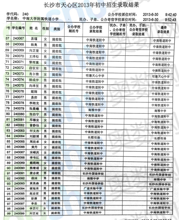 2013年中南大学附属铁道小学小升初微机派位录取结果(4)