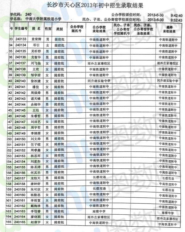 2013年中南大学附属铁道小学小升初微机派位录取结果(6)