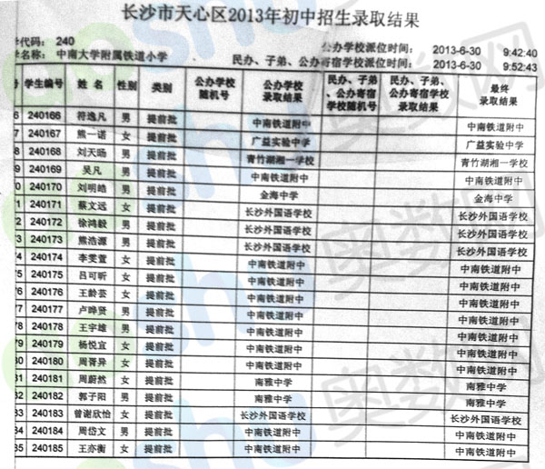 2013年中南大学附属铁道小学小升初微机派位录取结果(7)