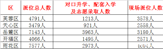今年全市城区共有小学毕业生34667人,其中残疾儿童、公办特色学校提前招收特长生、子弟学校和民办学校自主招生共招收5873人,高新区实行划片招生招生1738人,五区派位总数27056人,其中乡镇(场)学校对口升学、配套学校配套入学及志愿录取人数为10565人。多校派位人数为16491人。