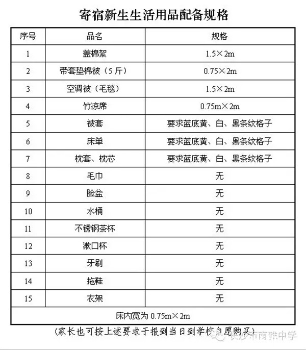 1、军训期间所有学生必须全部住校,(1)走读生由学校安排临时床位,敬请走读生家长于8月25日来校时备齐学生所需生活用品(自带水桶、拖鞋、水杯、换洗衣物、空调被、单人席子、衣架及其它生活必备用品等,严禁携带火种及危险物品和贵重物品),由班主任安排临时床位,军训结束后再搬走行李;(2)寄宿学生由班主任安排正式床位,带齐个人生活必需用品。