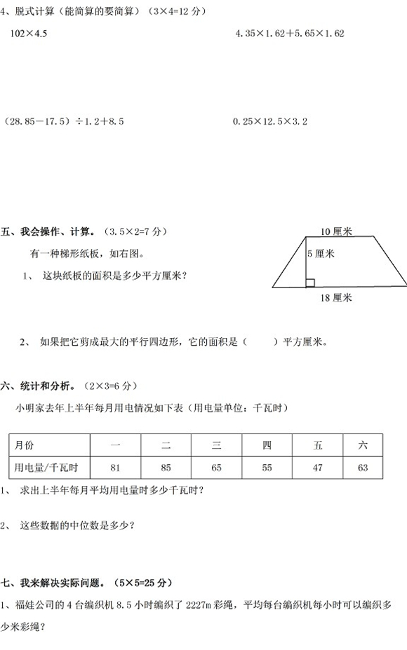 长沙小学数学五年级上册期末试卷(三)(3)