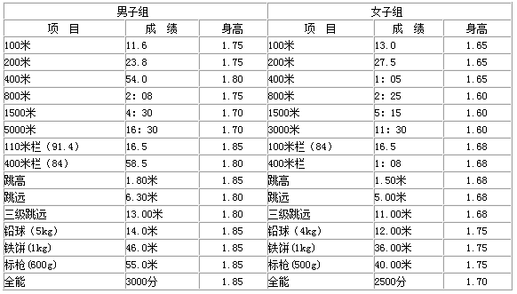 注:1.径赛成绩标准均为手计时。
