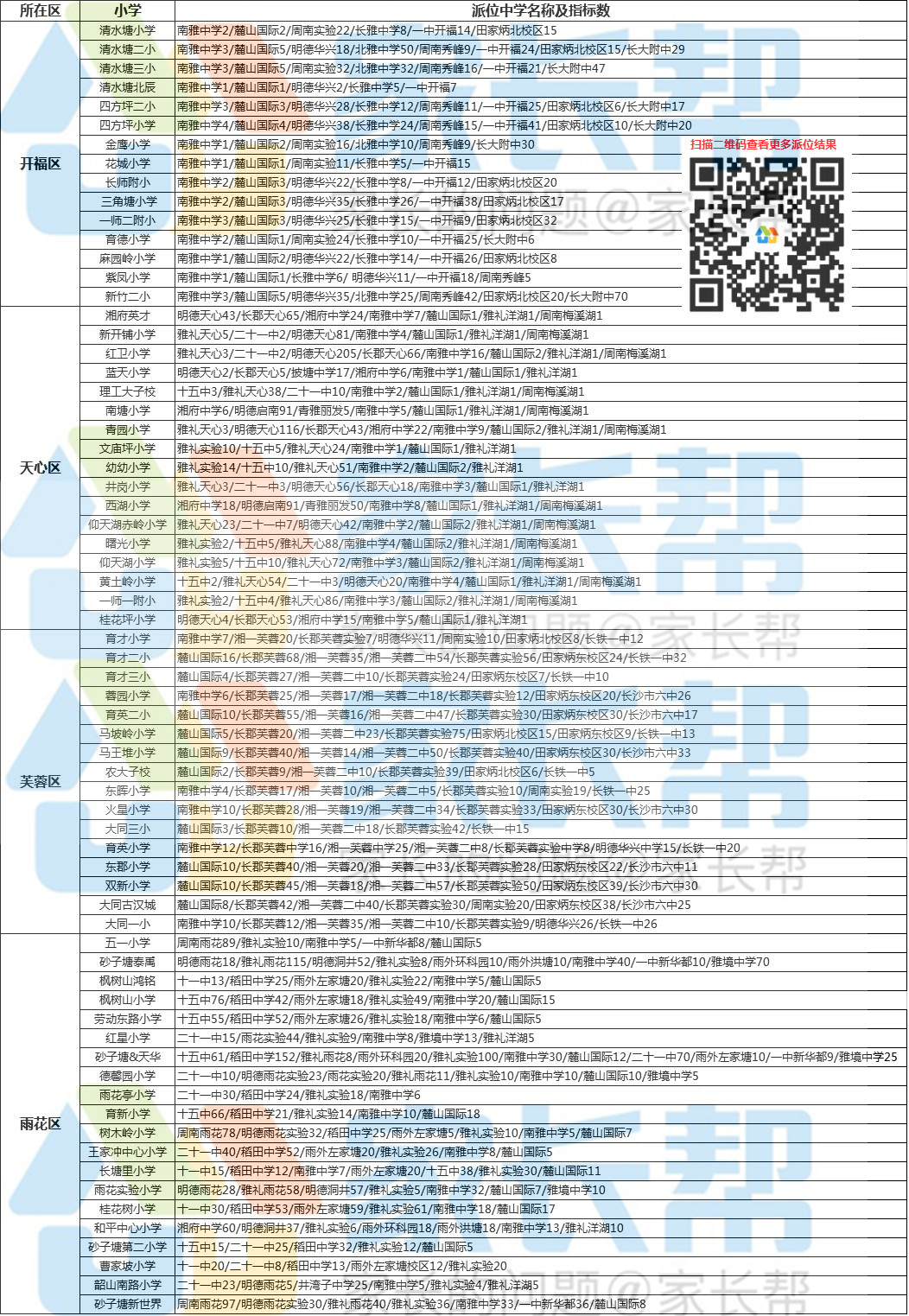 下表为2017年长沙小升初微机派位各小学分配到的初中派位学校以及指标人数汇总。该表不包含(已经提前录取的学生、跨区派位学生等)特殊情况,仅为该小学参加微机派位的学生人数。以清水塘小学为例,该校今年共有小学应届毕业生156人,其中参与跨区派位11人,提前录取82人,实际参与派位只有63人,所以下表中清水塘小学的派位指标就只有63人。