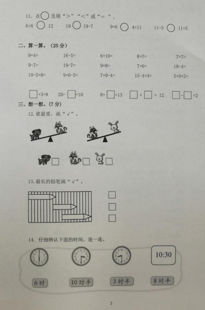 2021成都市高新区一年级上册数学期末试卷(图片版)(2)