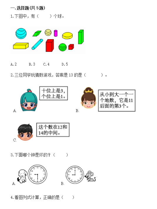 2022年人教版小学一年级数学上册期末试卷(图片版)