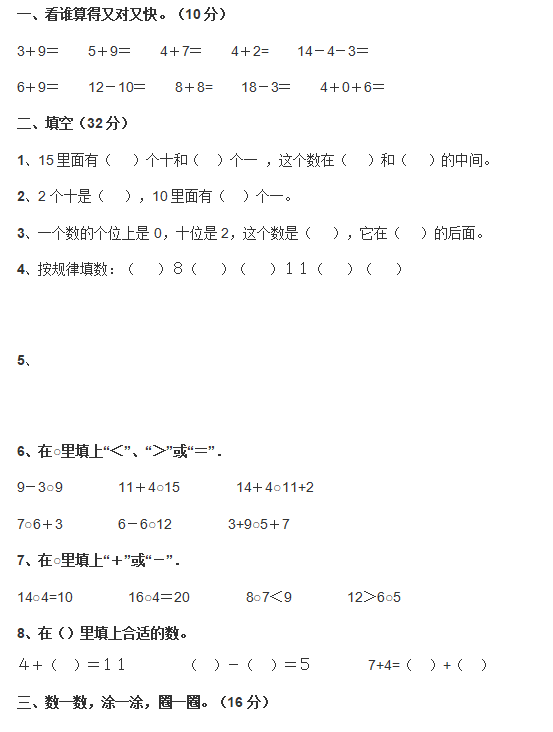 2022年人教版小学一年级数学上册期末试卷七(图片版)