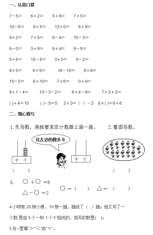 2022年苏教版小学一年级数学上册期末试卷三(图片版)