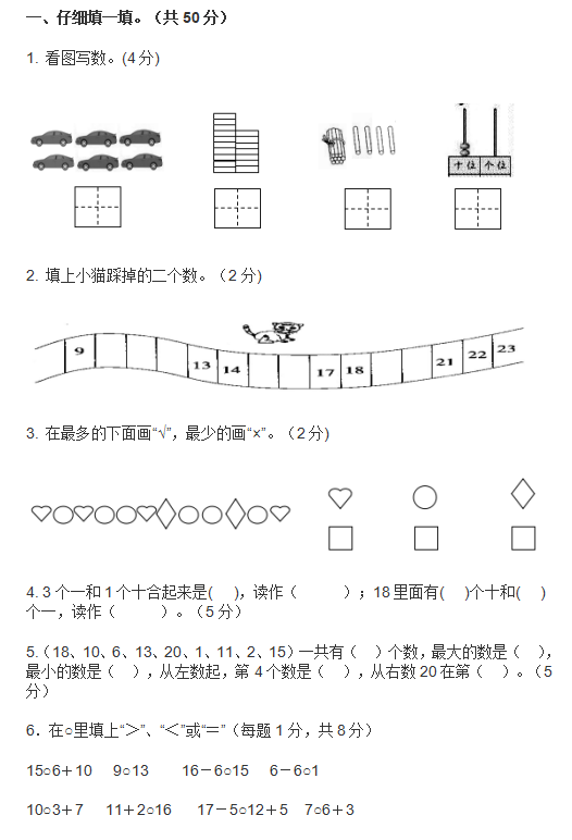 2022年人教版小学一年级数学上册期末试卷十(图片版)
